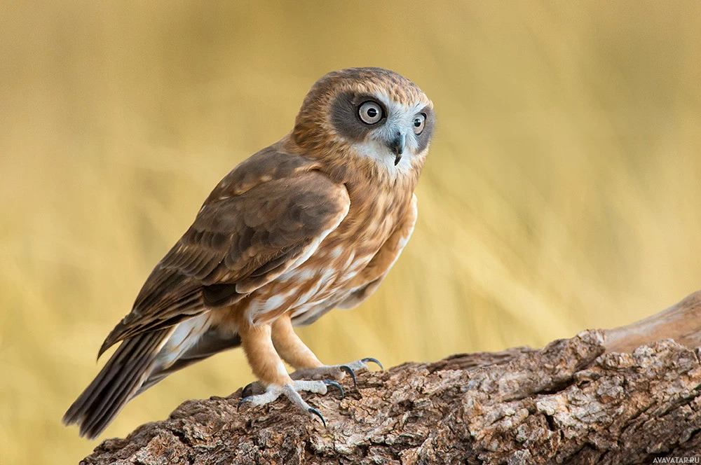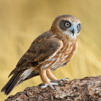 The picture features a bird, specifically an owl. It is standing on a surface that could be a branch or a piece of wood in