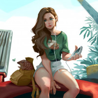 casual clothing consisting of shorts and a green t-shirt, with a cat's head on the shirt, suggesting a playful or whimsical style. She has