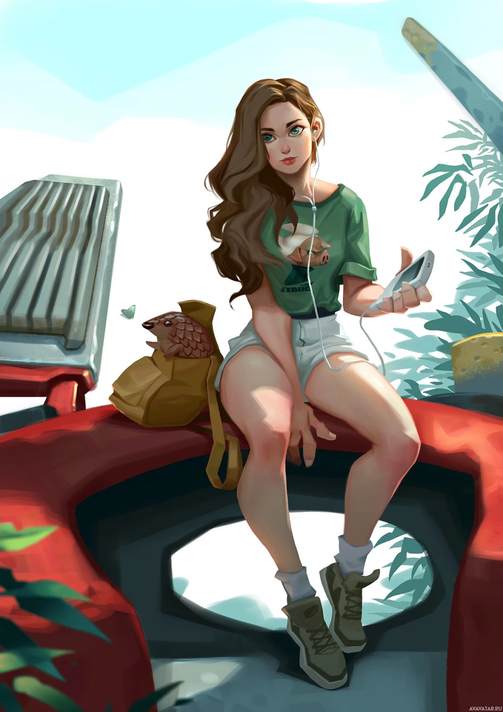long hair and is holding what appears to be a pair of headphones in her hand, indicating she might be listening to music or perhaps preparing to use them. There are also items on the bench with her, including a bag that resembles an orange-colored purse. The setting looks like