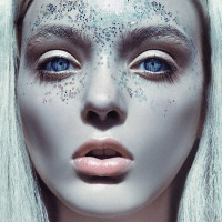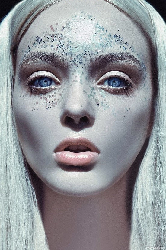 blue eyes and pale, translucent skin. Her hair appears to be styled in a way that it drapes over her shoulders or parted on the side. She has facial markings that could suggest a character from fantasy literature or a concept for a performance