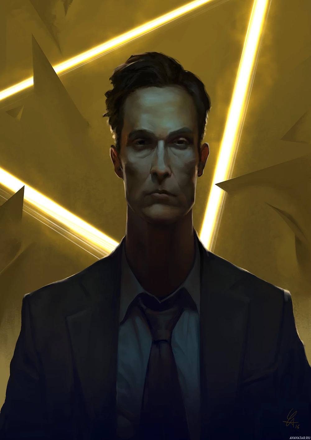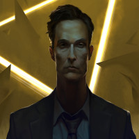 portrait of a man. He appears to be wearing a suit and tie, suggesting a formal or professional attire. The artwork has a dark tone with contrasting yellow highlights that create an intriguing
