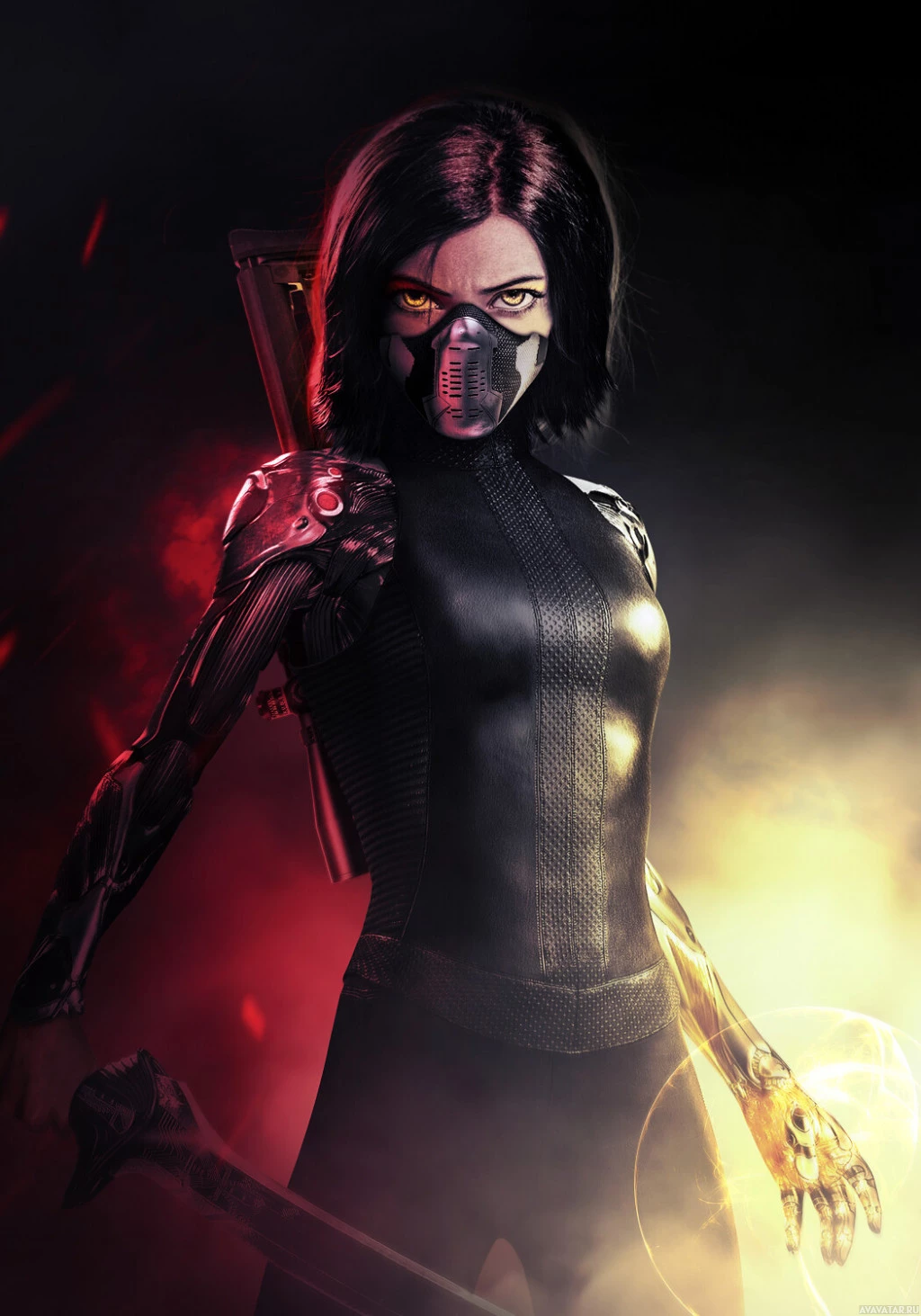 a gas mask over her mouth. Her hair is dark and straight, and she has