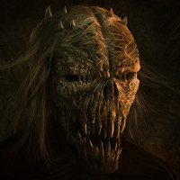 the mouth area of the face, giving it a demonic or monstrous appearance. This character could be interpreted as a representation of horror or the supernatural due to its unsettling and exaggerated features.