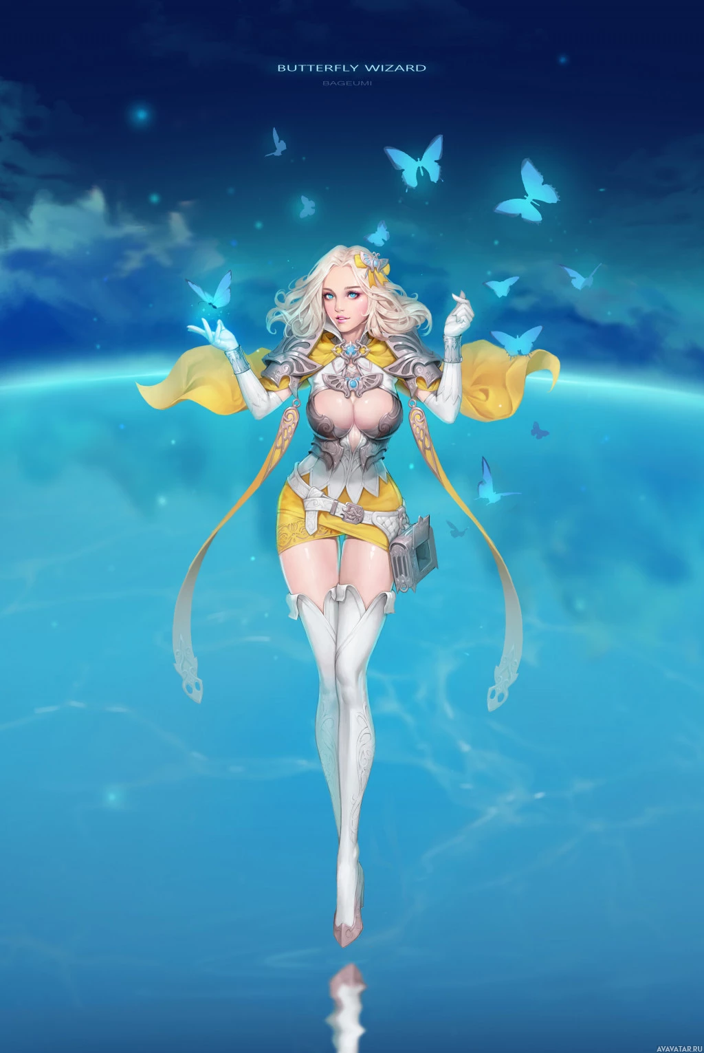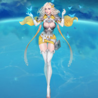 blonde hair, wearing a cloak and holding what seems to be a staff or weapon. She is standing on clouds or vapor in the sky, with