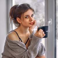 На картинке изображена молодая женщина, сидящая возле окна. У нее в руке чашка, и она, кажется, потягивает ее. Женщина носит непринужденный наряд с видимым верхом и, кажется, наслаждается моментом расслабления или созерцания. Обстановка предполагает пребывание в помещении, возможно, домашнее или офисное пространство.
