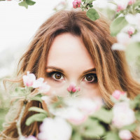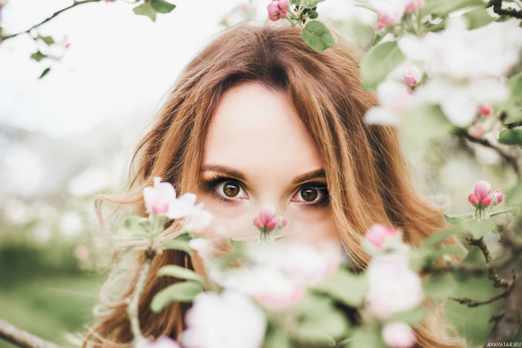 In the image, there is a person whose face is visible but their eyes are obscured by blossoming