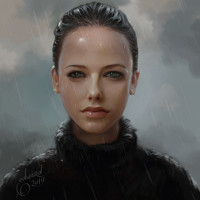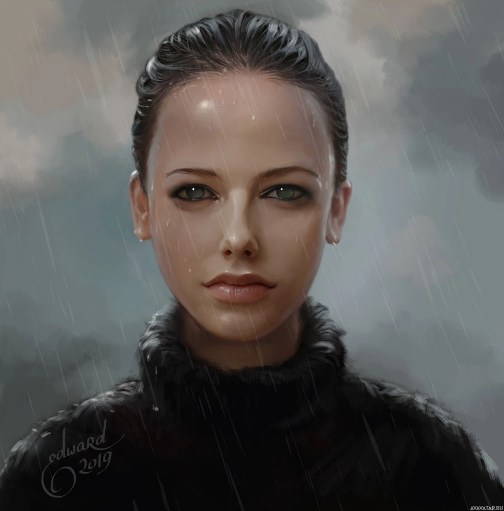 dark clothing, possibly a coat or jacket with a fur collar. Her expression is serious, and she's looking slightly away from the viewer, not directly at them. The setting suggests it might be raining, as indicated by the overcast sky and her