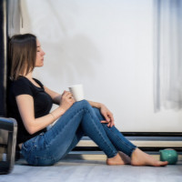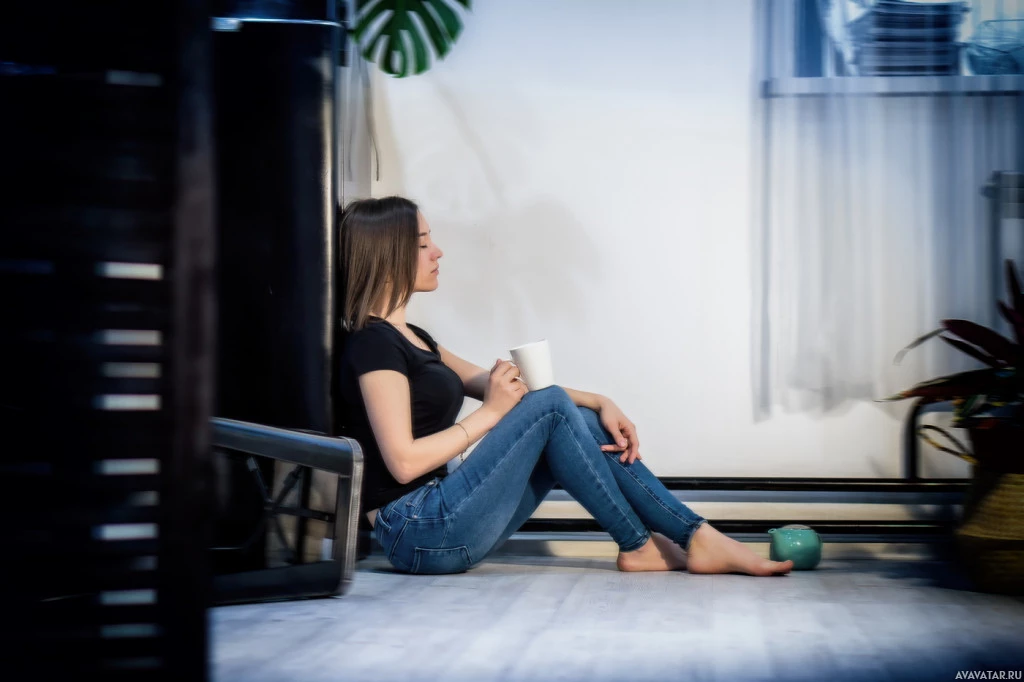 The image shows a person sitting on the floor inside what appears to be a home. The individual is wearing