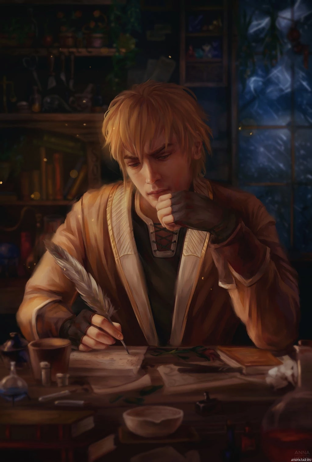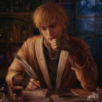 magical tools or materials. The character is holding a quill and appears to be writing or reviewing something on the papers in front of him. The setting looks like a study or workroom, possibly belonging to someone who practices magic.