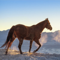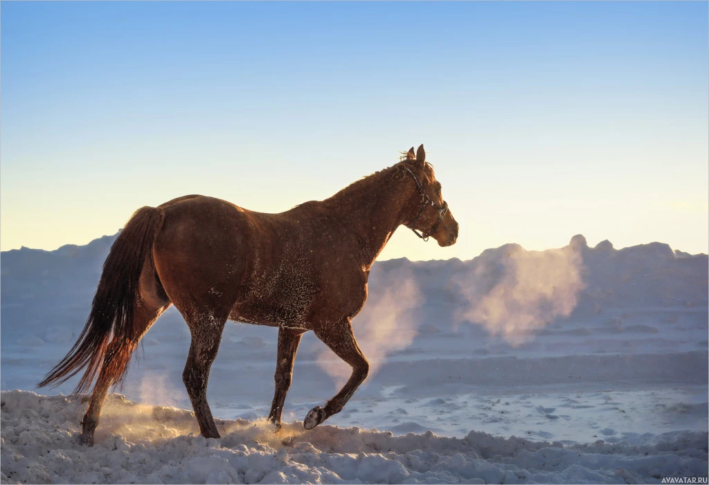 The image shows a horse walking on what appears to be snow-