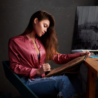 art supplies, including paintbrushes, pencils, and possibly some paper or canvas for her artwork. Her attire and the setting suggest a creative and professional environment, likely a studio or