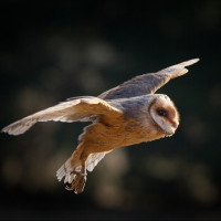 The image shows a bird, specifically an owl, in flight. It's captured mid-flight with its wings fully spread out and its head turned to the side, which is typical for owls as they have