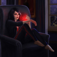dark hair, sitting on an armchair in a room that looks like it's either nighttime or indoors with low lighting. The character is wearing a black top and pants with red accents, and she has a somewhat