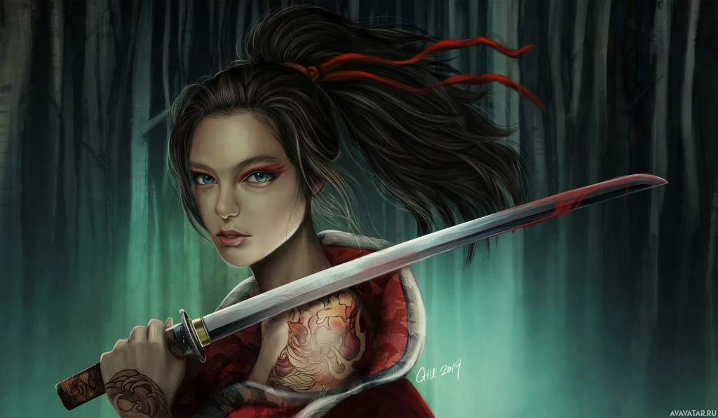 a red outfit that resembles traditional Japanese clothing, which might be associated with samurai or warrior attire. In her right hand, she is holding