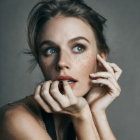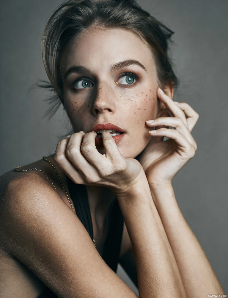 The image features a woman with freckles on her face and neck. She appears to be in a contemplative or introspective pose, with one