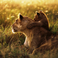 tall grass. They are sitting close together, possibly during the golden hour as suggested by the warm,