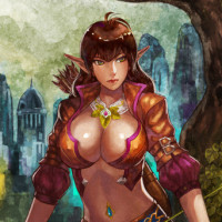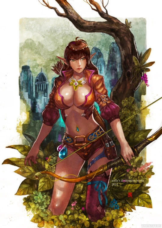 an illustrated character that appears to be a fantasy-themed elf. She is wearing armor and holding a bow, suggesting she might be a warrior or archer in her context. Her attire and the surrounding foliage give a sense of a natural, possibly