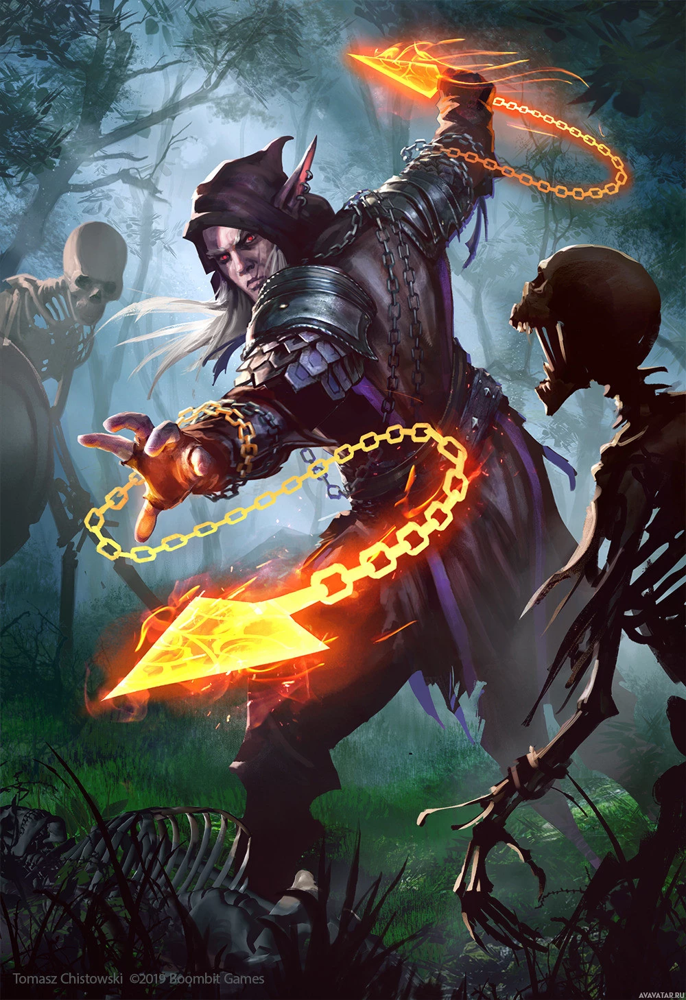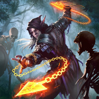 long hair, wearing dark clothing adorned with glowing runes and holding chains in each hand, suggesting they might be casting spells or performing some sort of magic. The setting is