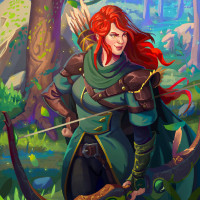 The image depicts an illustrated character who appears to be a female warrior or archer, possibly from