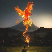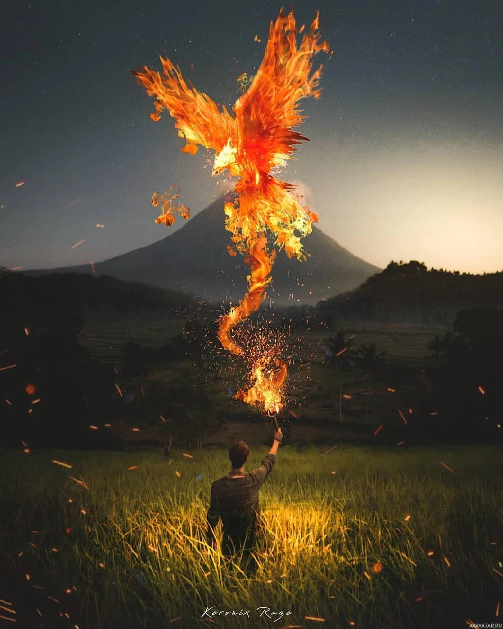 the grass at dusk with a large phoenix rising from their hands, surrounded by flames. In the background, there is a silhouette of a mountain or hill and what appears to be a volcano emitting smoke or steam into