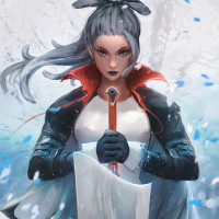 falling snow. The artwork has an illustrated style and is likely related to a fantasy or heroic theme, given the character's attire and the presence of a staff or wand which could be used for magic or combat in