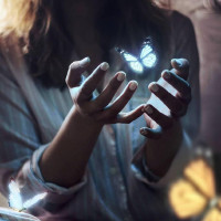 gentle interaction between the person and the insects. The background is softly blurred, drawing focus to the butterflies and the hands holding them. The colors are muted, giving the image a tranquil and intimate feel.