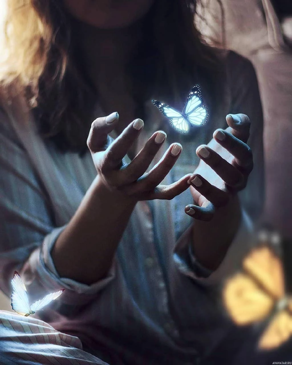 The image depicts a person's hands gently cradling two butterflies in their palms. It appears to be a moment of
