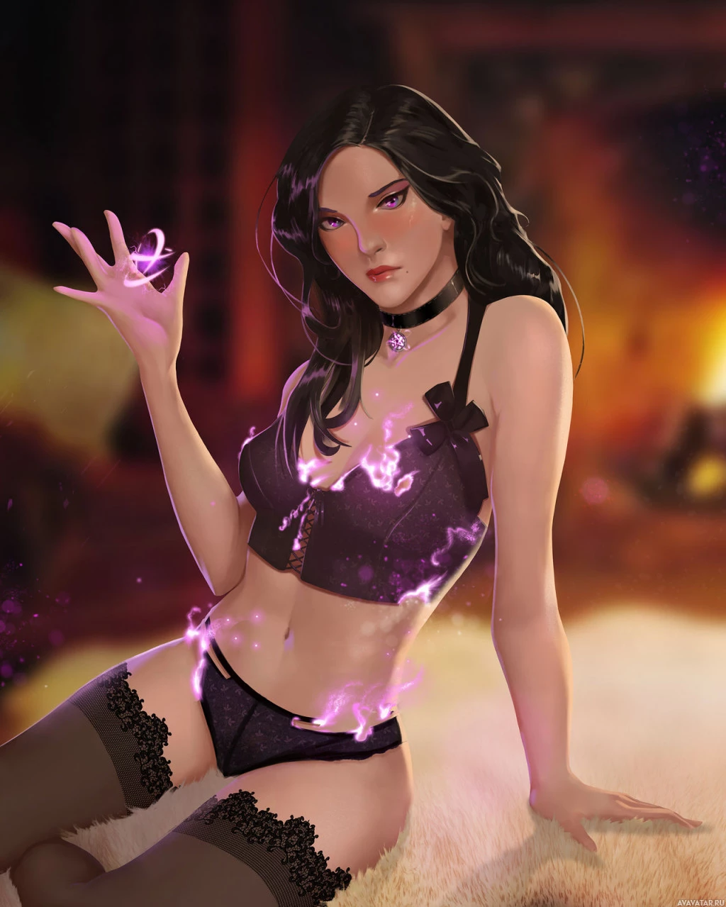 The image depicts a character that resembles Yennefer, a popular character from "The Witcher"