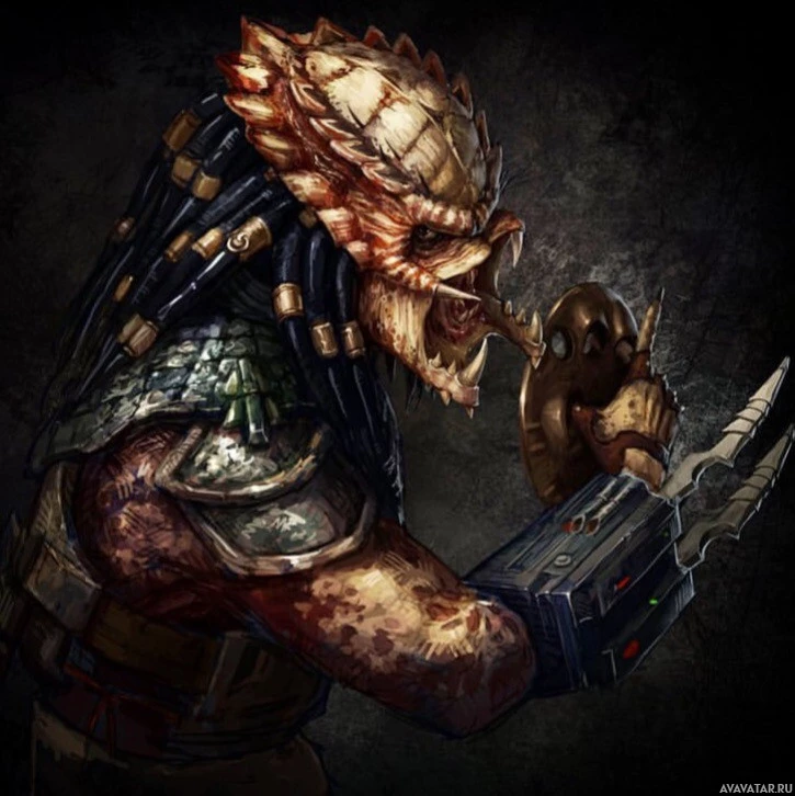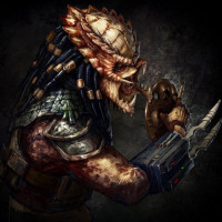 The image depicts an illustration of a character that appears to be inspired by the Predator from