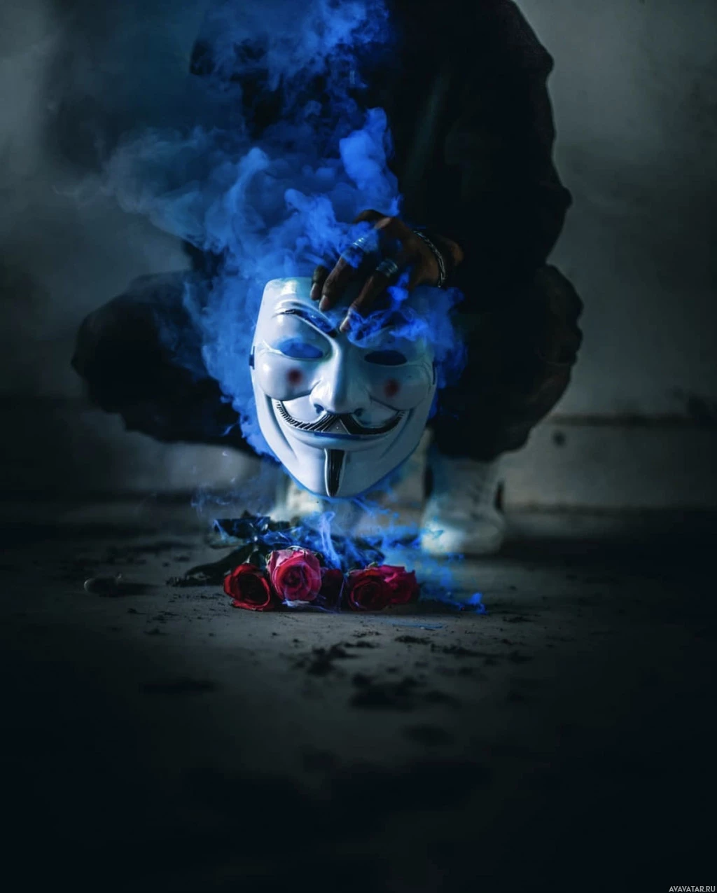 The image shows a person wearing a mask resembling the iconic Guy Fawkes mask from the film "V for Vendetta," which is often associated with