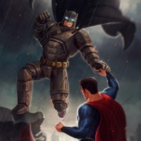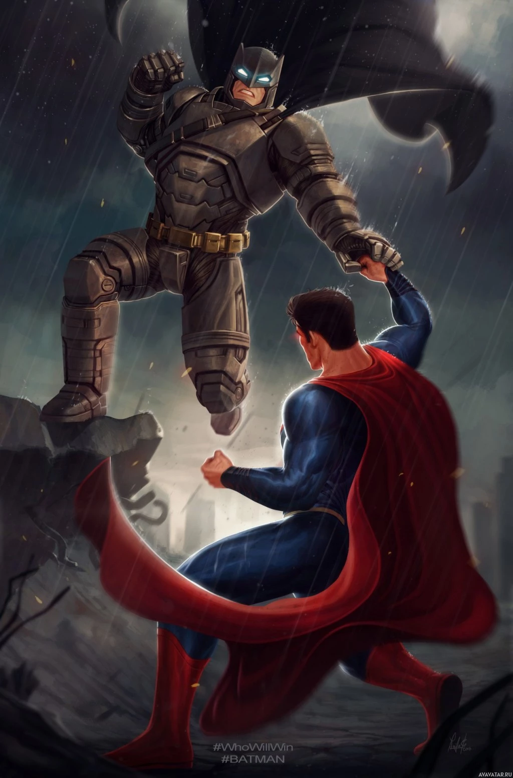 a dynamic pose that suggests they may be in the middle of a fight or confrontation. Batman is on the left side of the image, wearing his signature armored suit, while Superman is on the right side, dressed in his blue and red