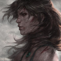 a stern expression and her hair blowing in what seems to be a windy situation. There are visible injuries on her face and clothing, suggesting she has been through some