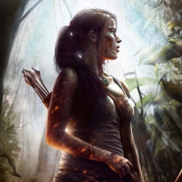 a female character who appears to be inspired by Lara Croft from the video game series "Tomb Raider." She is holding a bow and arrow, which suggests she might be in