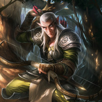 The image depicts an elven character from a fantasy setting. This character is holding a bow and arrow, dressed in armor with elements that suggest they are a warrior or archer. The environment appears to be a forest or wilderness, which fits the typical fantasy backdrop for elves.