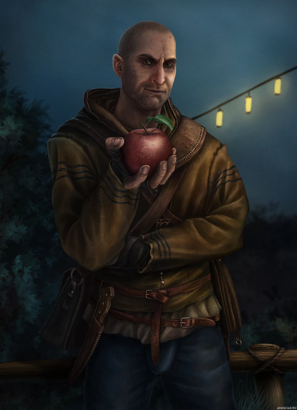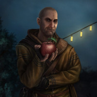the video game "The Witcher 3: Wild Hunt." He is portrayed holding an apple and wearing what appears to be