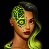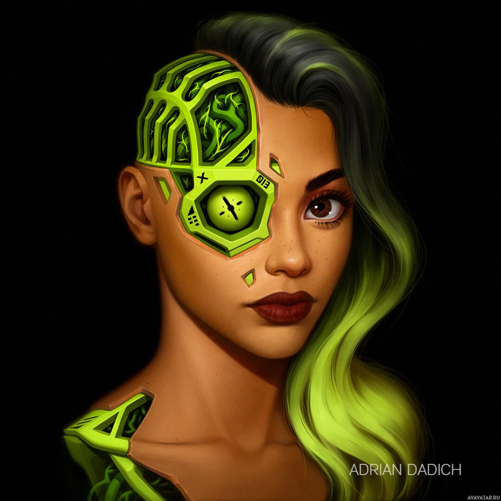 a unique design on her head, resembling mechanical or cybernetic elements in shades of green and black. This suggests she might be portrayed as