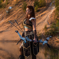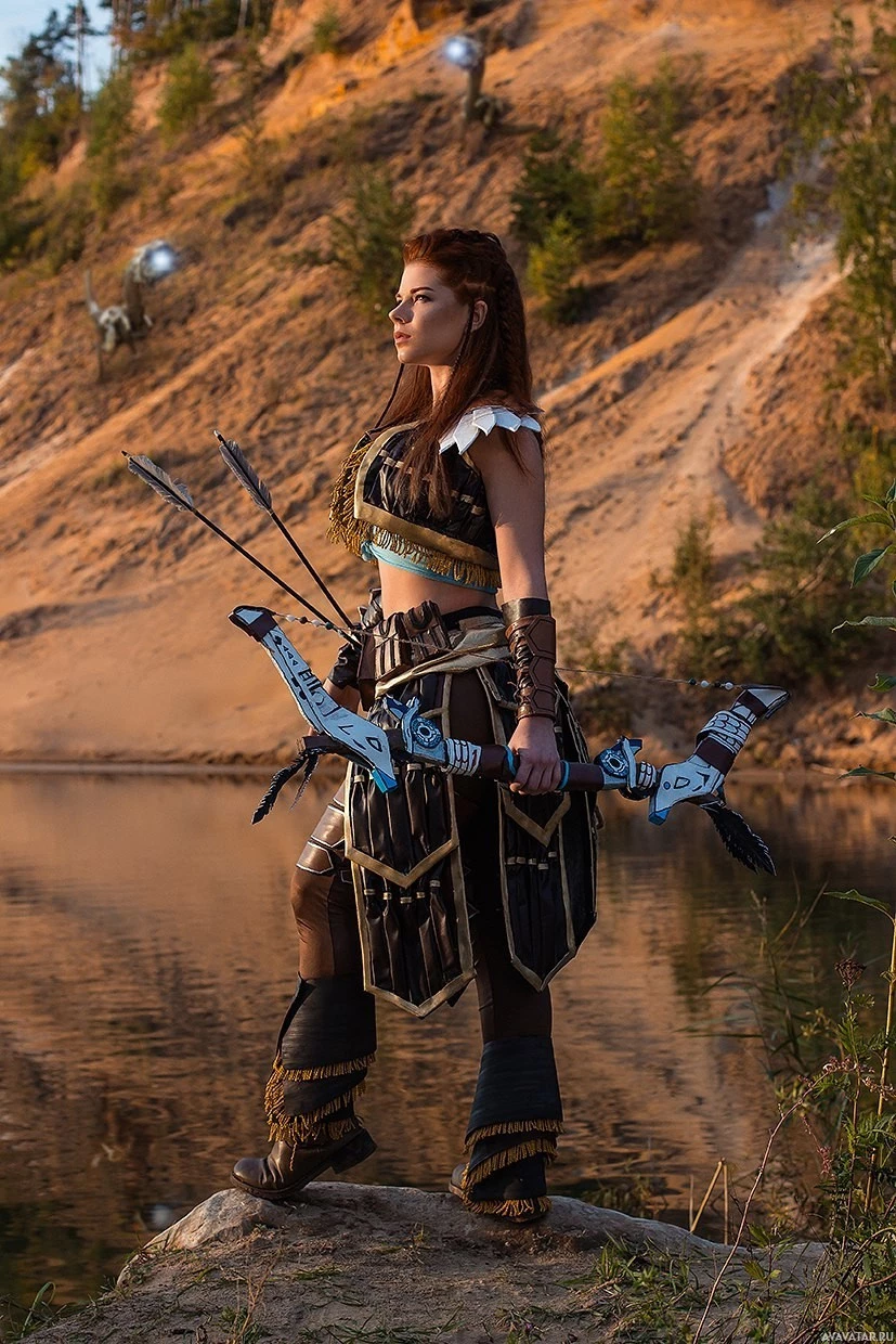 the video game "Horizon Zero Dawn." They are posing with a bow and arrow, wearing armor and costume that resembles that of Aloy,