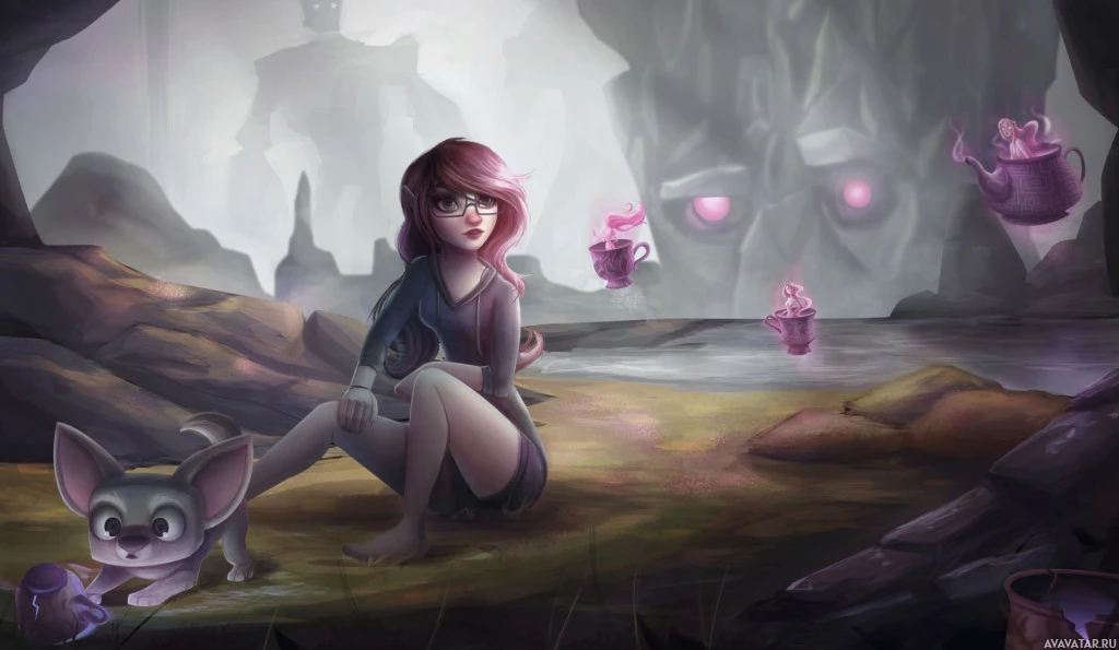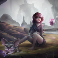 magical creatures around them—specifically, two foxes at their feet. In the background, there's a cave-like entrance to another part of