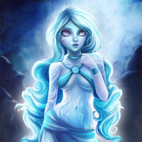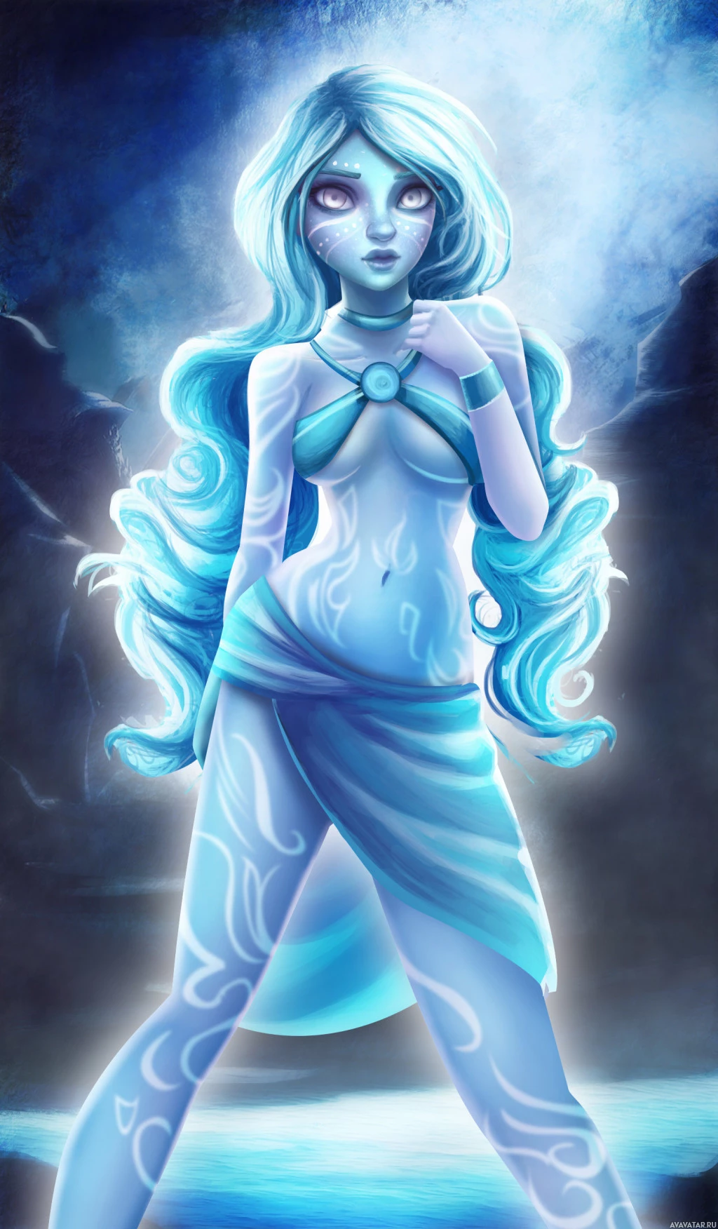 a female character with ethereal features. She has blue skin and long flowing hair that appears to be made of or resembling mist or vapor, which is a common element in