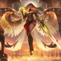 an illustrated character who appears to be an angel-like figure with wings and an ethereal presence. The character is standing confidently, holding a staff that emits light, which suggests they might have some sort of magical or divine powers. There are also smaller figures in the background that look like human-like characters, possibly indicating the setting is within