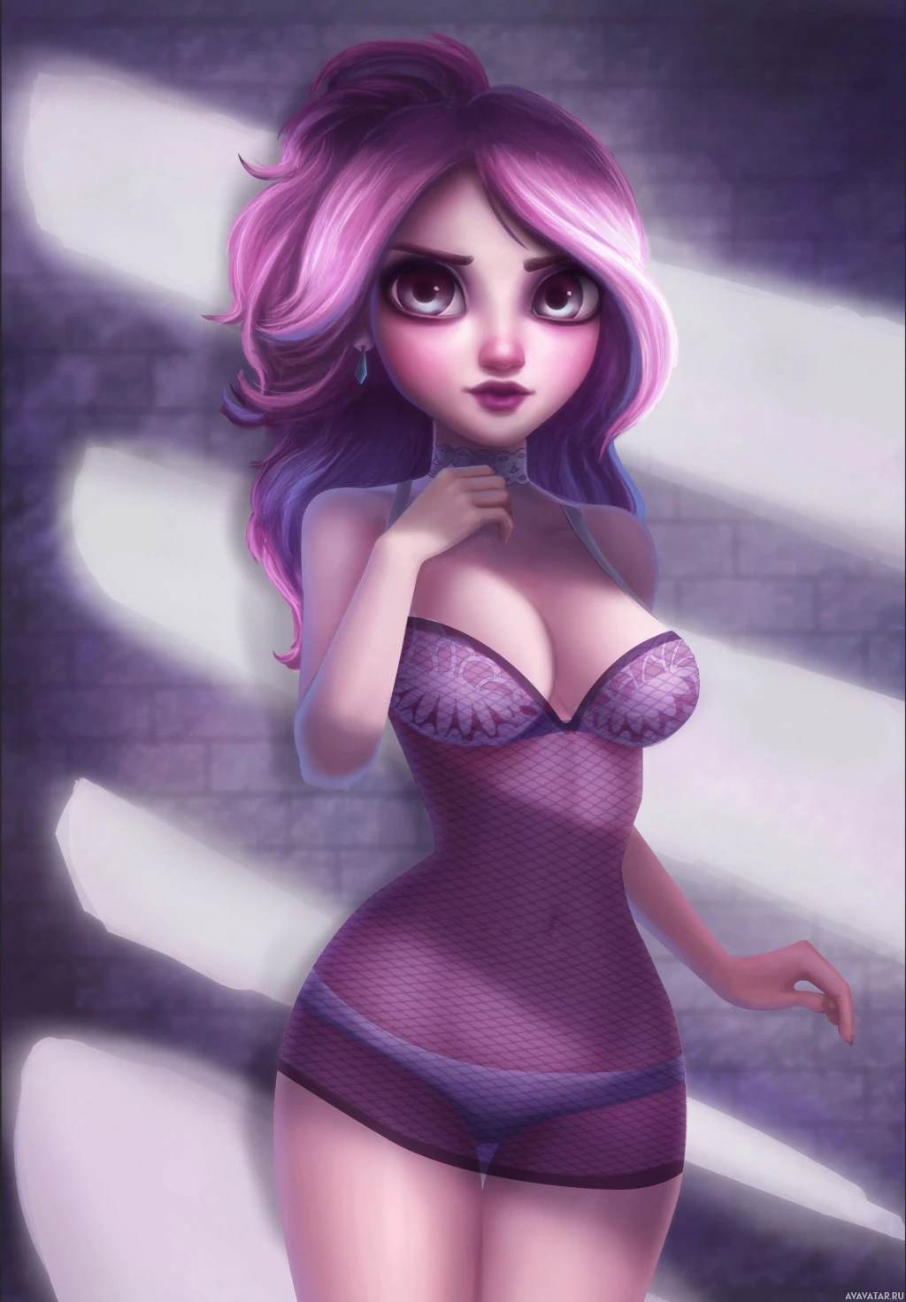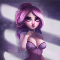 female character with purple hair, wearing lingerie. She has a confident and seductive expression on her face. The background suggests
