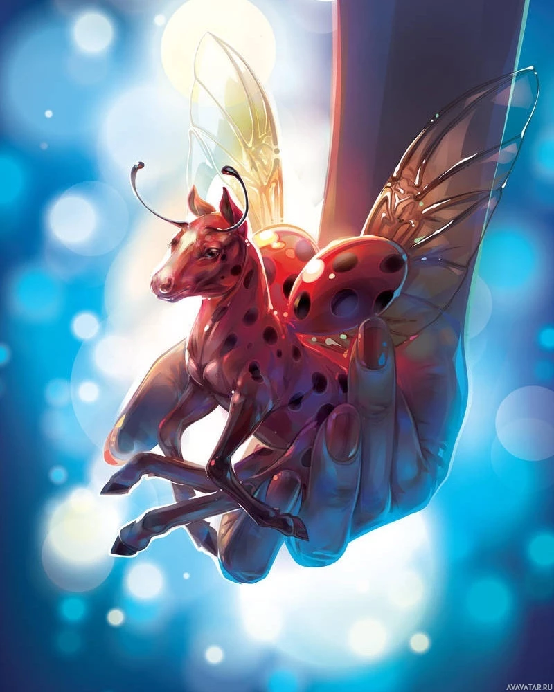 The image shows a hand holding an insect, which appears to be a ladybug, and within the ladybug's body is another insect that looks like a cow. This creates an artistic and imaginative scene where one creature contains another as part of its design. It's a playful and whimsical depiction of two different
