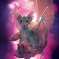 The image shows a cute and whimsical depiction of a small cat with bat-like wings. It is sitting in someone's hand, which suggests the cat may have a special or magical quality that enables it to fly like a bat. The background has a purple hue with what appears to be sparkling stars, adding to the enchanting atmosphere of the scene.