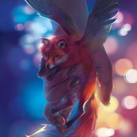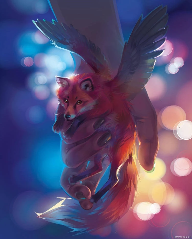 a red fox with wings, which is an artistic and fantastical depiction as real-life foxes do not possess wings. It appears to be in the hands of someone who seems to be holding it carefully. The background features blurred lights that suggest