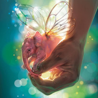 a fantastical scene where the hand of a person is holding an elephant. However, this is not a typical representation because the elephant has wings on its back like those found on fairies or other
