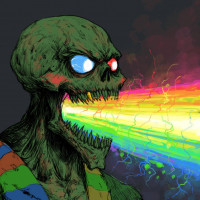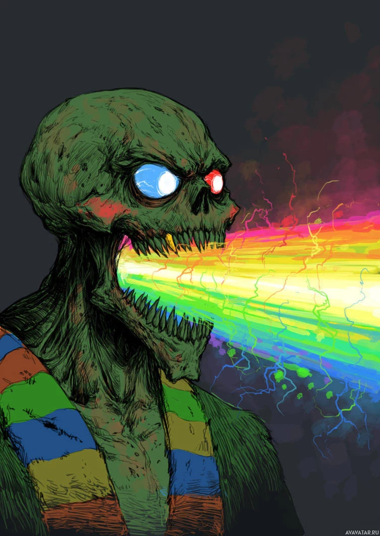 a fantastical creature, which appears to be a skeletal figure with a somewhat menacing expression. The creature has its mouth wide open and is emitting a colorful, rainbow-like energy from its mouth, suggesting some form of magical or supernatural power. It's wearing a scarf that seems to have the colors of a spectrum in