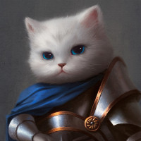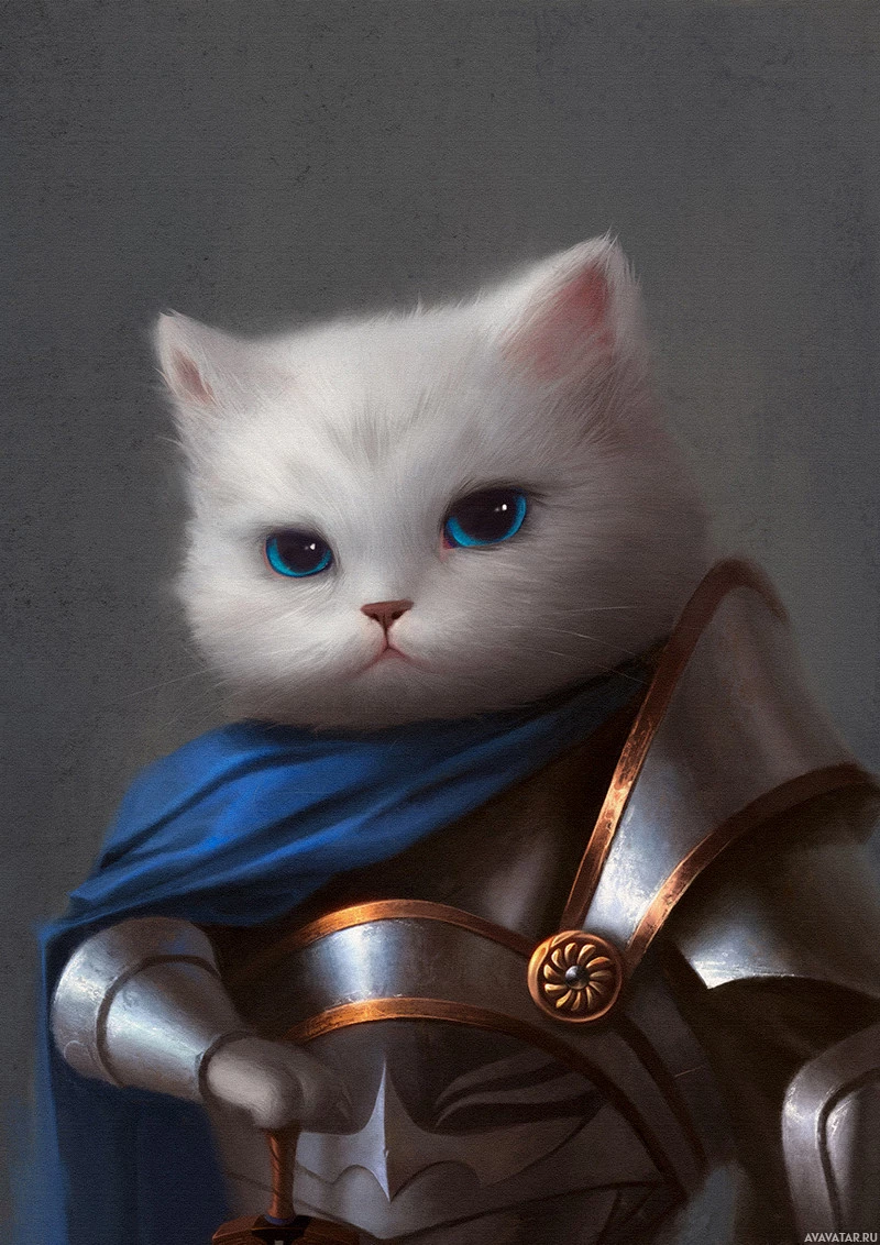 The image features a stylized illustration of a cat dressed as a warrior. The cat is wearing armor with a helmet and has a sword in its paw, giving it a regal or heroic appearance. It's holding what appears to be a shield with the emblem of a lion on it. The cat also has a blue cape around its neck and a collar that is part of