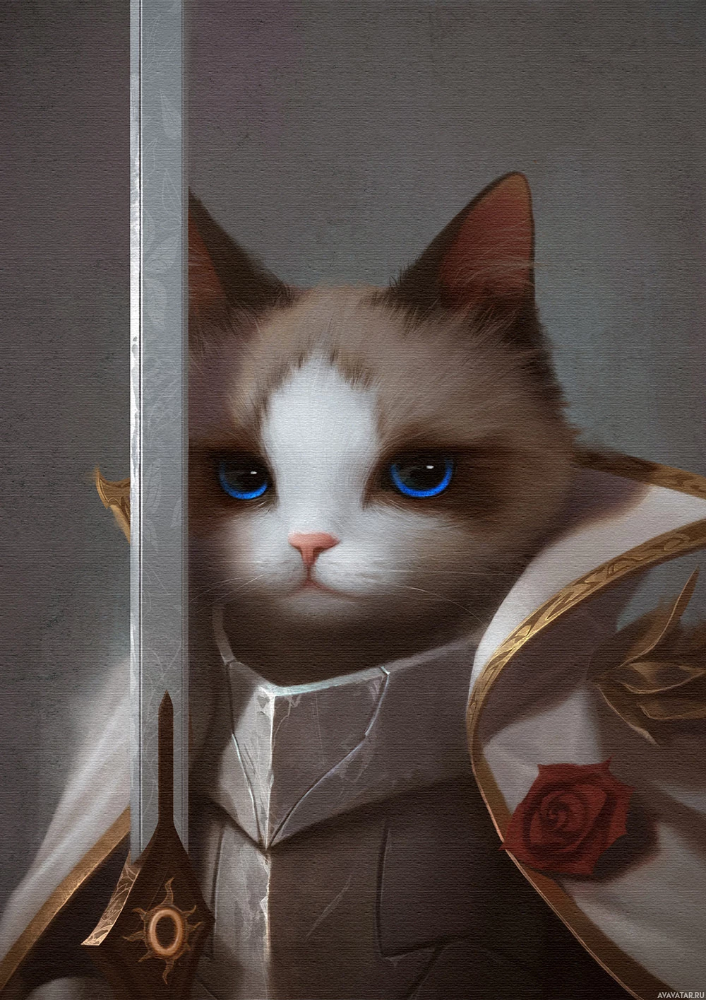 a suit of armor that includes a breastplate with a gold emblem and a sword at its side. The cat's ears are pointed upwards, and it appears to be peeking from behind the shield or