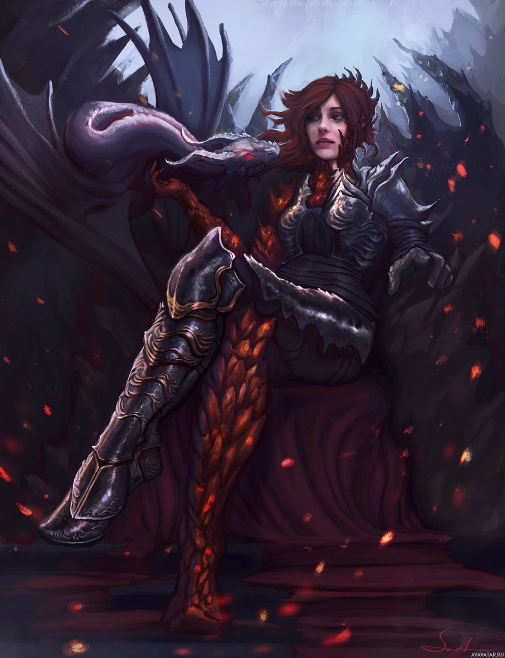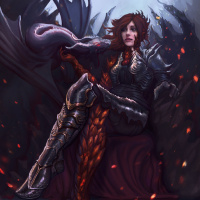 a female character with red hair seated on what appears to be a throne. She is wearing a medieval-style armor with plates and has dragon-like horns on her head. There are also dark, bat-like