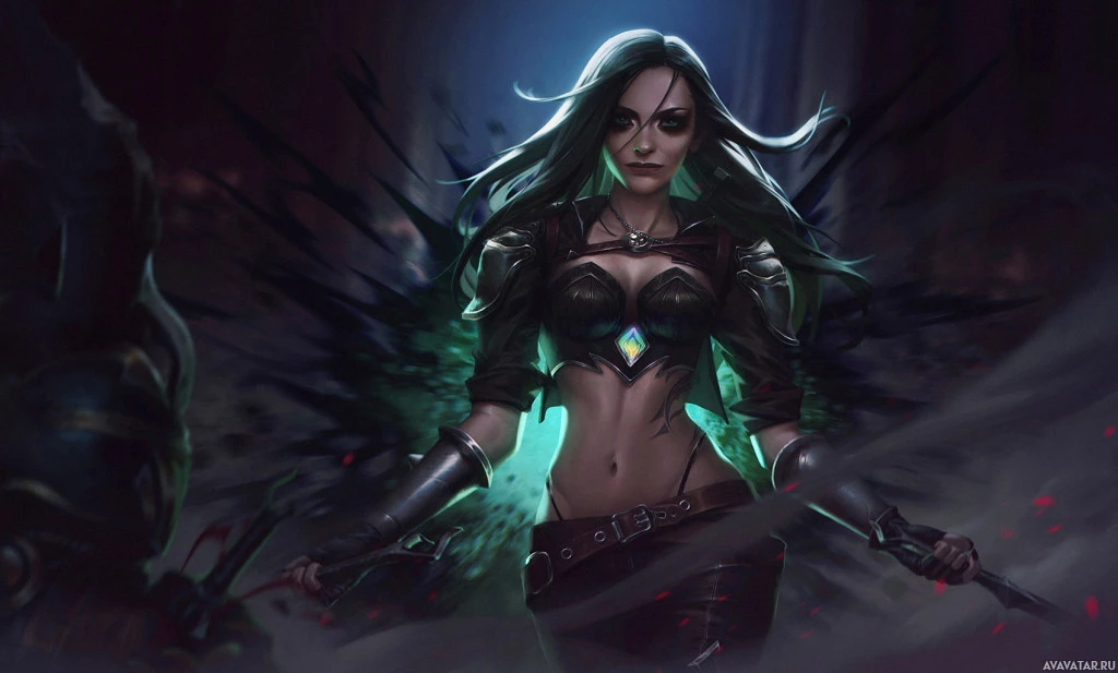 The image features a stylized artwork of Katarina, a character from the popular online multiplayer game